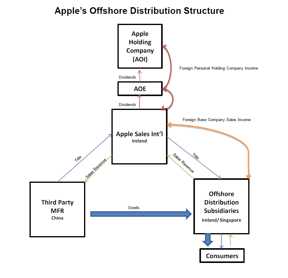 苹果在爱尔兰注册Apple Sales Int’l (简称ASI,上图中间位置的公司) 公司。ASI从中国工厂(Third Party MFR China,上图左下角)以成本价采购组装完成的苹果产品后,再以接近零售价向离岸分销商(Offshore Distribution Subsidiaries)出售,实现将大部分利润留在爱尔兰的ASI。