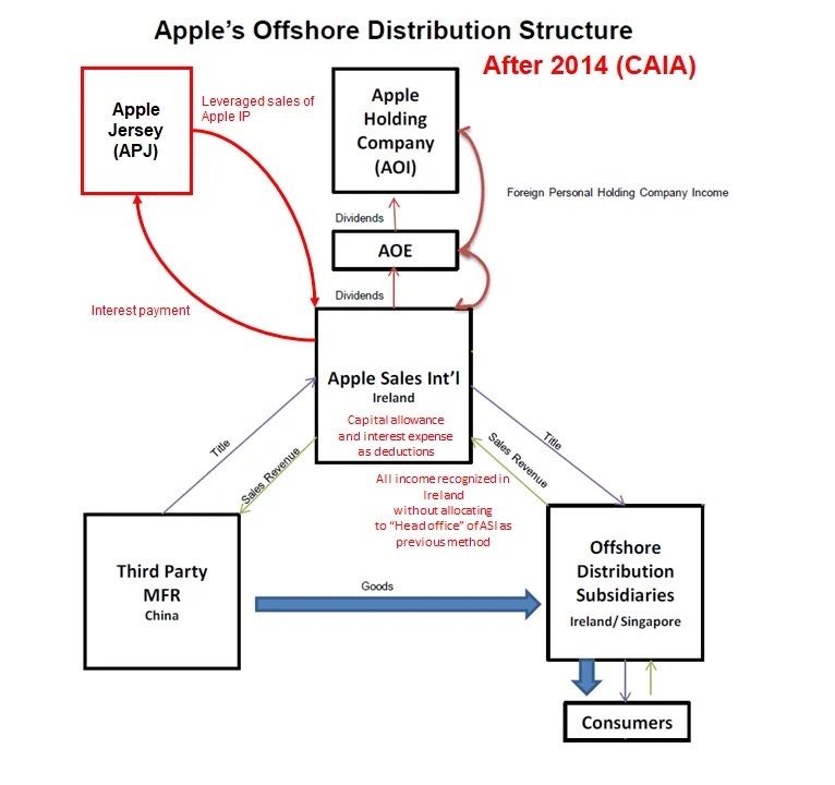 2017年美国进行税法改革(TCJA),对境外无形资产形成的低税利润征收10.5% - 13.125% GILTI税(全称为Global Intangible Low-Taxed Income,即全球无形资产低税收入)。但是,由于新税法接受CAIA作为可抵税支出,因此苹果继续免缴美国税,GILTI反避税失效。