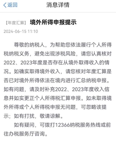 2024年6月17日,有人在网上分享以下的截图,声称收到中国税务局关于境外股票所得申报的“温馨提示”: