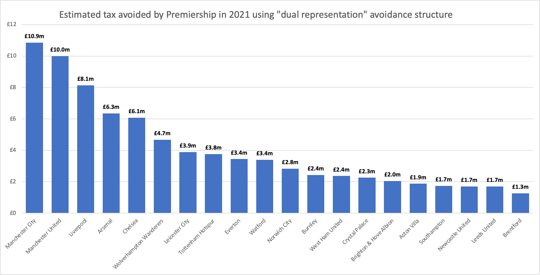 英国广播公司(简称BBC)在2023年3月30日发布了一篇报道:《英超球队如何规避2.5亿英镑(折合人民币21亿)的税费》(请见原文:Premier League Clubs avoided £250m in tax, expert estimate)。该报道引述一份来自英国的税收政策协会(Tax Policy Associates)一份调查报告:《英超球会如何规避4.7亿英镑税费,以及如何制止》(New report: how Premier League Football clubs have avoided £470m of tax, and how to stop it)。这份报告指出大量英超球队利用足球中介来避税。